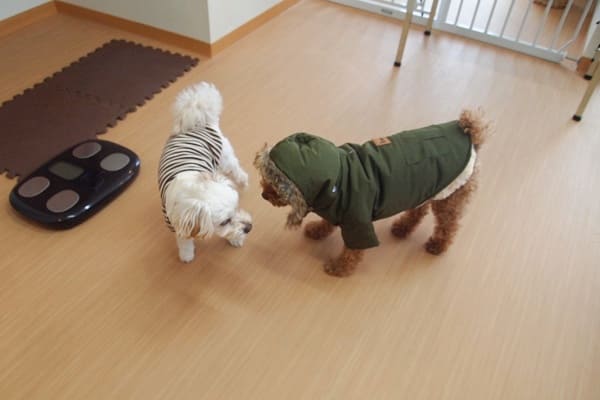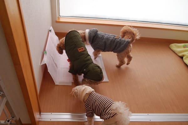 看板犬たちは、ある程度モモちゃんのニオイを確認できたからと満足して、家の中に帰っていきました。