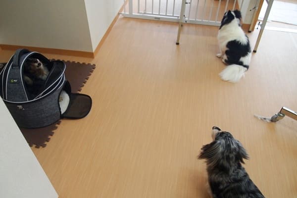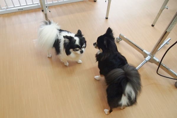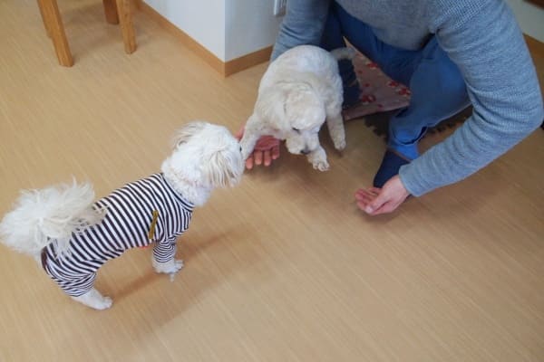 まずはミラに追いかけられ、主人と戯れ、慣れてきた頃にミラのニオイを嗅ぎに行っていました。