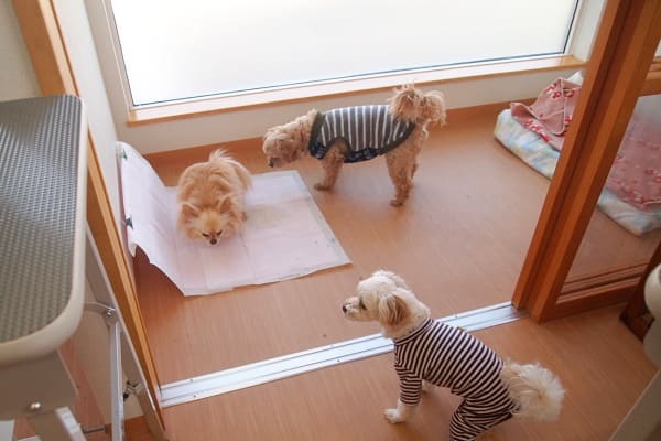 シンバちゃんもティアラちゃんも、来てすぐにトイレシートの上でおしっこ。