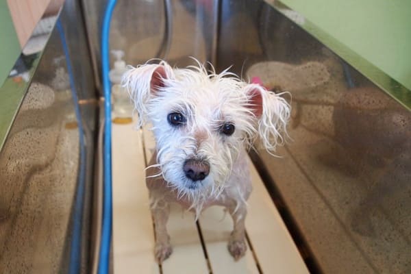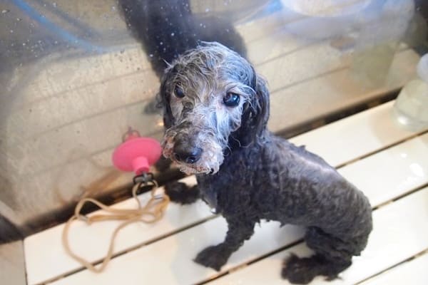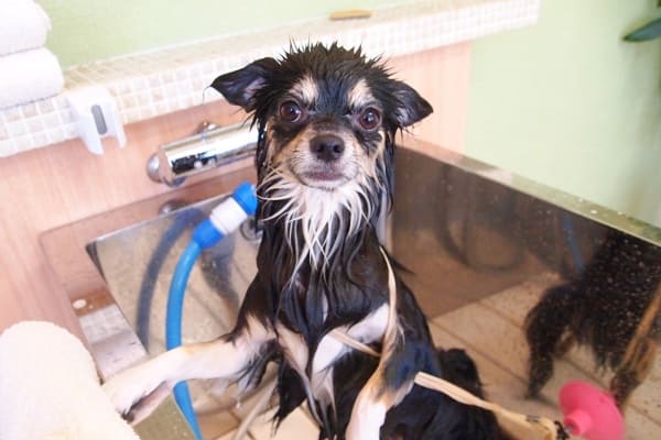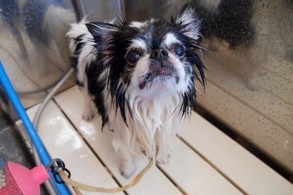 あいちゃん、シャンプー前に気が付きましたが、前脚に採血後に巻かれたであろうテープがそのままになってました。