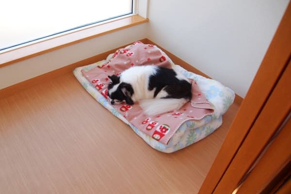 入口がいいかと思って座布団やマットを移動させたけど、床の上がいいんだそうです。