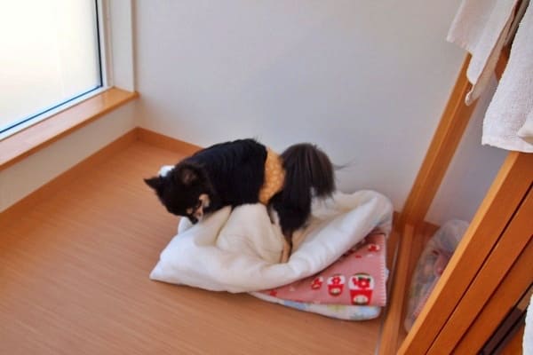 寒いといけないからと、ごっつい綿毛布の上に、あったかいクッション、もこもこストールと着なくなったもこもこの上着を置いていますが、それらが全部ウンチまみれになっていました。