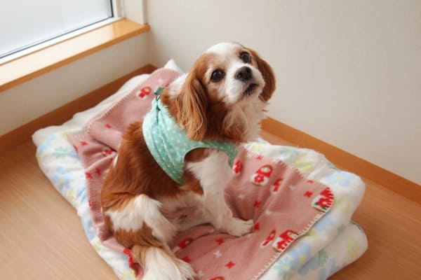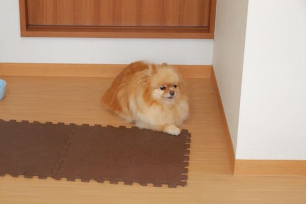 窓の近くに布団も敷いてあって、少しだけそこで座ってみたもののやっぱり床の上に座るモコちゃん。