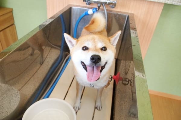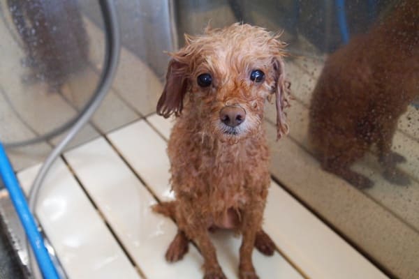 お尻の方を洗う時は、むぎちゃんにも余裕があるのか「わんわん」言えるのですが、前胸あたりは余裕もなく声も出ない様子。