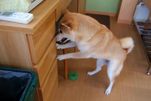 おもちゃは足元にあるのに、まだ新しいおもちゃがあるんじゃないかと引き出しを掘り始めるむぎちゃん。