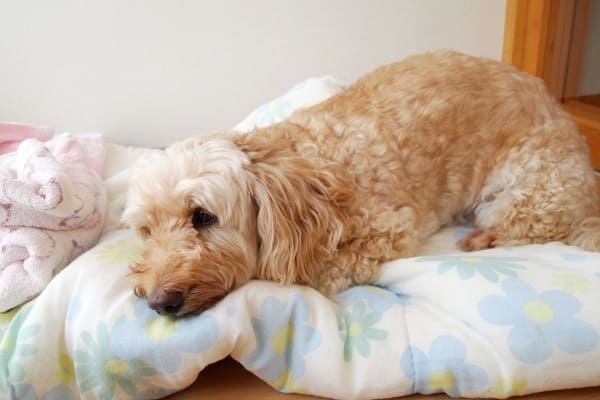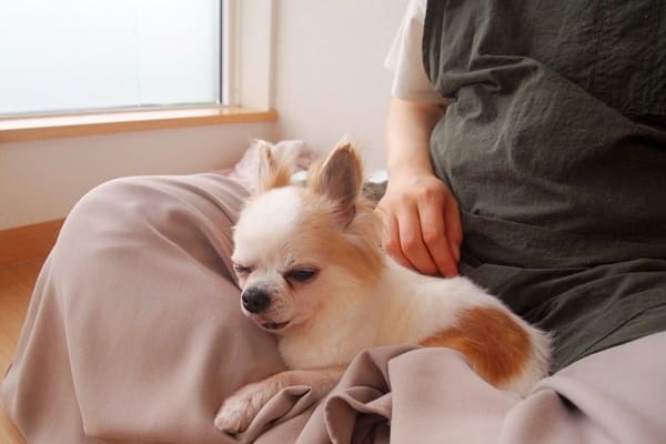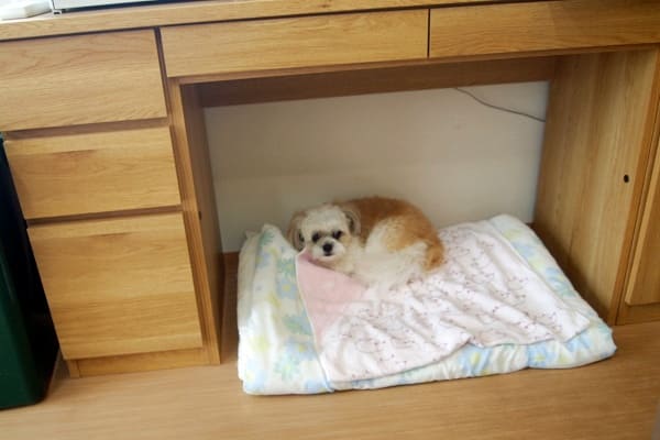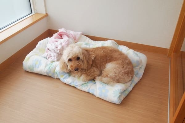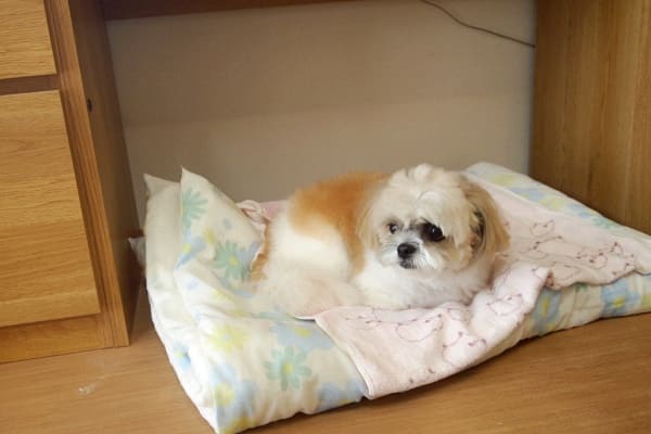 ブロー後は布団でまったりして、カットが終わるとお迎えが来るんじゃないかとそわそわするんです。