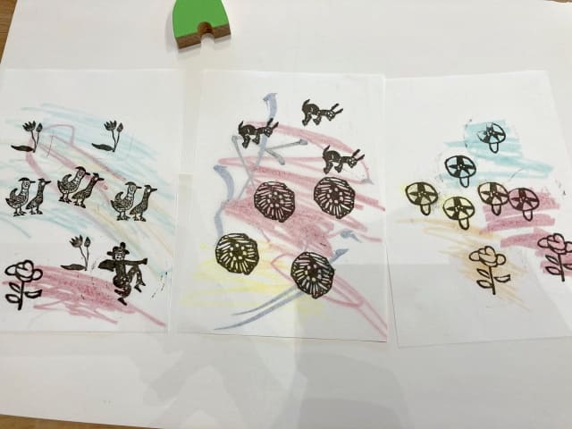 棟方志功の作品のスタンプを押して、その裏から色付けするというもの。