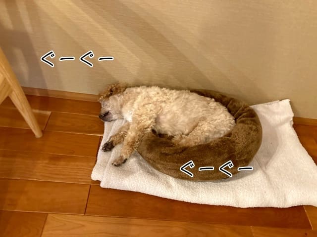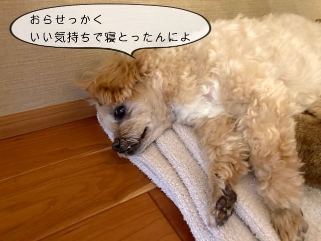 愛犬ミラ用に買ったベッドなのにコニーが使うもんだから、そりゃはみ出るよね。