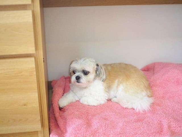 お店の布団はあられちゃん仕様で、机の下にスタンバイしておきました。