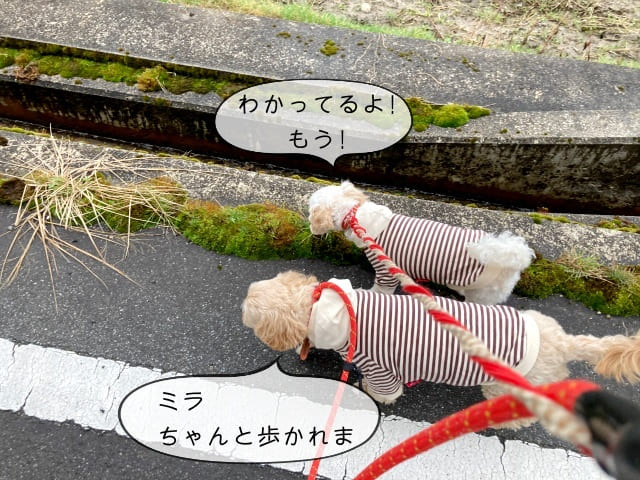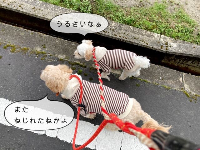 そのままねじれをほどくことなく、散歩を続けていると、今度は愛犬コニーとのリードでねじねじができてきます。