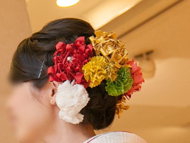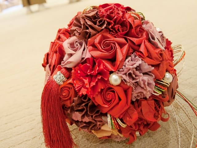 その後のお色直しで着た打掛に合わせた髪飾りとブーケは、折り紙でできています。