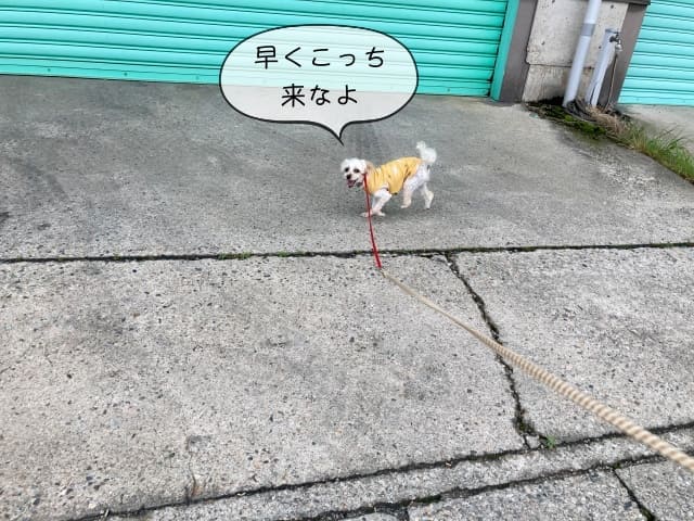 コニーは逆側の草むらに行きたがるので、手もリードもいっぱいいっぱい。