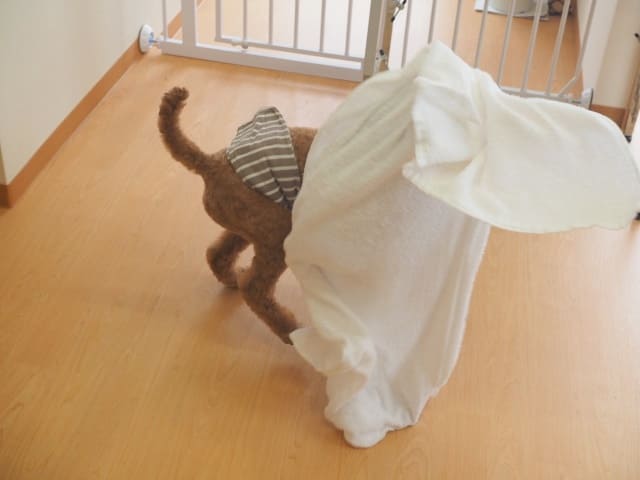 使用済みのタオルは、テーブルの横に掛けることが多いのですが、ココアちゃんはそれを見つけて遊ぼうとしてました。