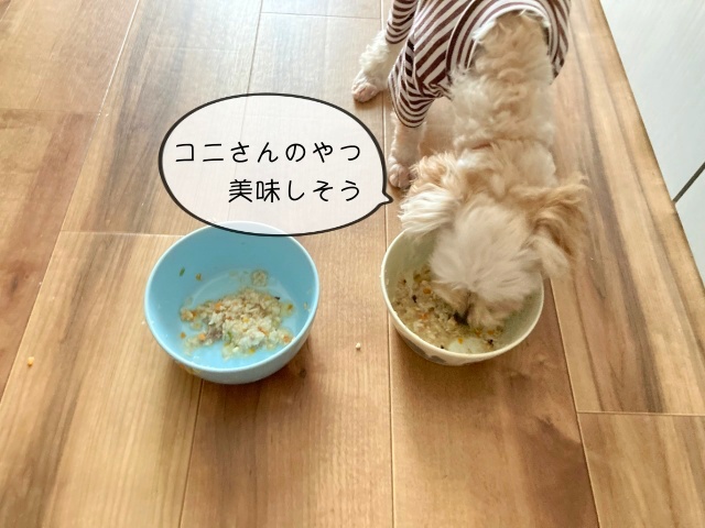 「コニさんのいいなぁ」とコニーの器を覗き込んでから、自分のを食べ始めます。