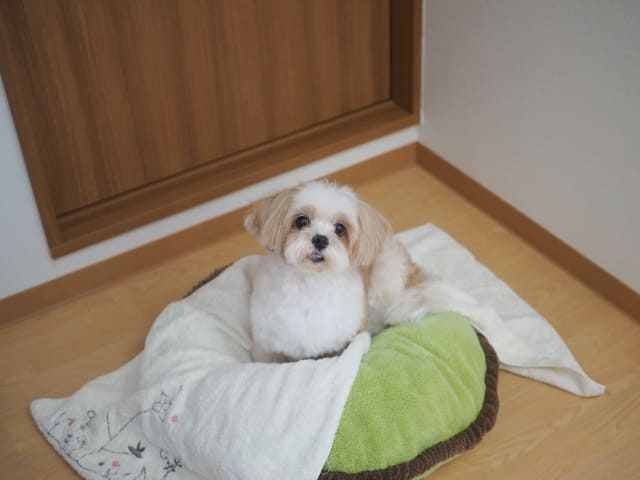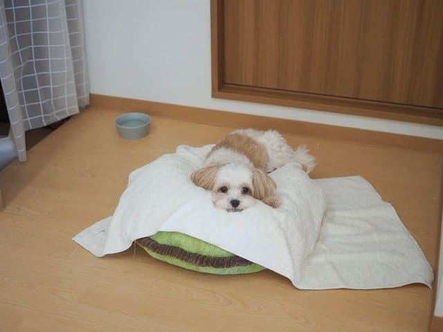 いつものベッドが乾いていなくて、急遽冬に使っていた座布団を出しましたが、喜んで使ってくれました。