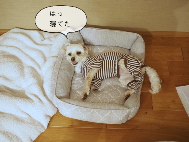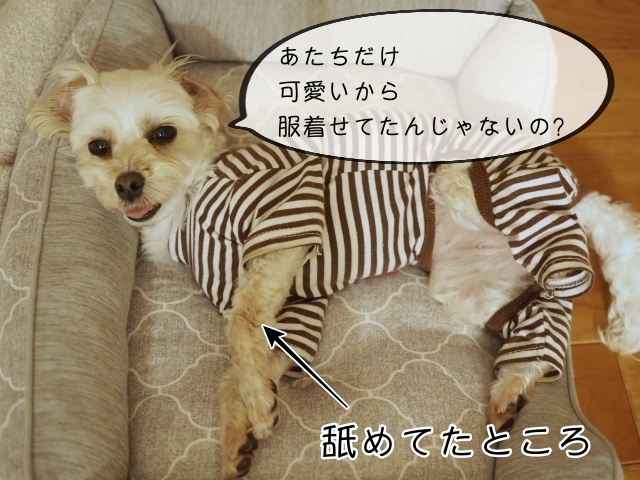 これまで、愛犬ミラは体を舐めまくるので、後ろ脚まで繋がっているロンパースを着せていました。