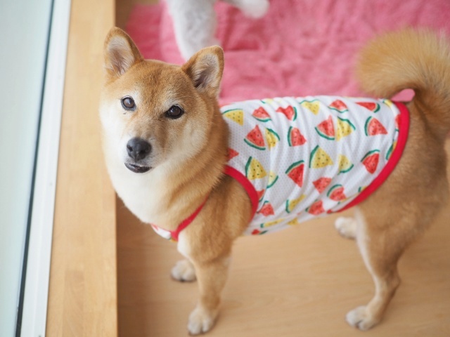 お揃いのスイカの服をお預かりしたので、終わってから着せました。