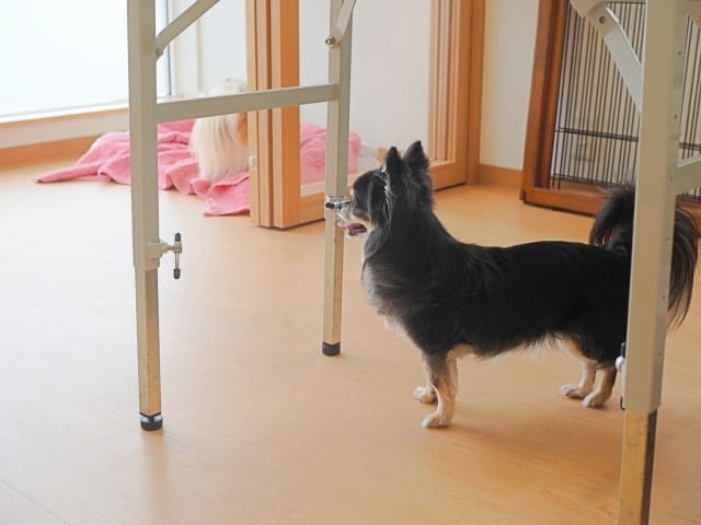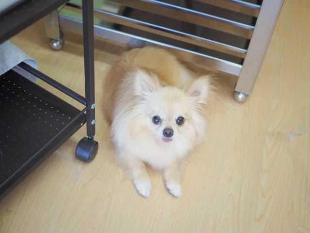 シンバちゃん、ティアラちゃんのシャンプー中はシンクの下、ブロー中はテーブルの近くが定位置。