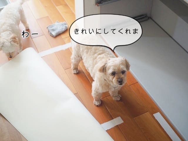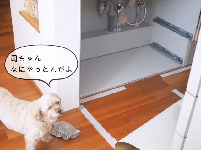 キッチンだけ床にフロアマットを貼り付けているので、その下もべちゃべちゃ。