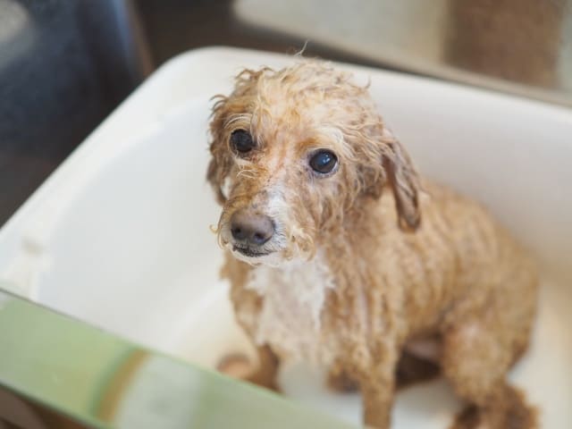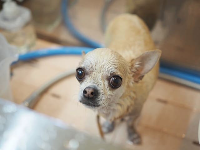 あまぐりちゃん、ドッグバスに浸かるのは嫌じゃないみたいでしたが、どうしてもお顔を流すのが苦手。