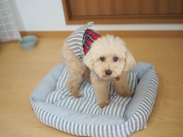 2種類の大きさがあるのですが、まろんちゃんは、小さめサイズだと入らなくて、大きめサイズだとぶかぶかです。