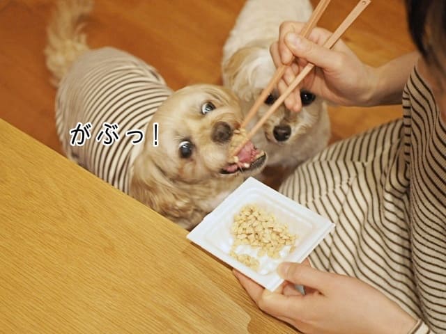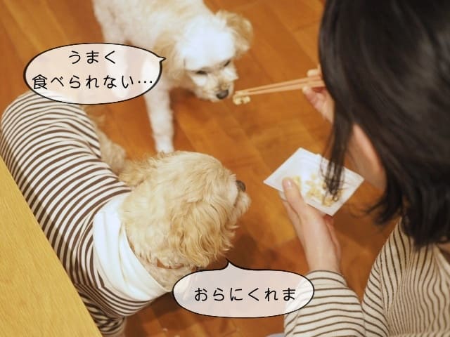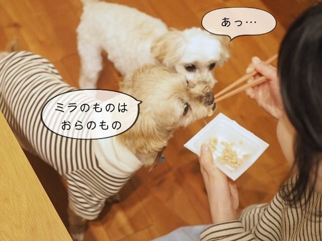 コニーは箸からでも上手に食べますが、ミラは下手くそです。