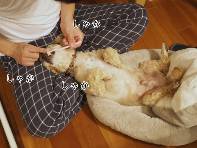 後ろ脚の爪切りはどうしても立てなかったので、私が椅子に座って抱っこして行いました。