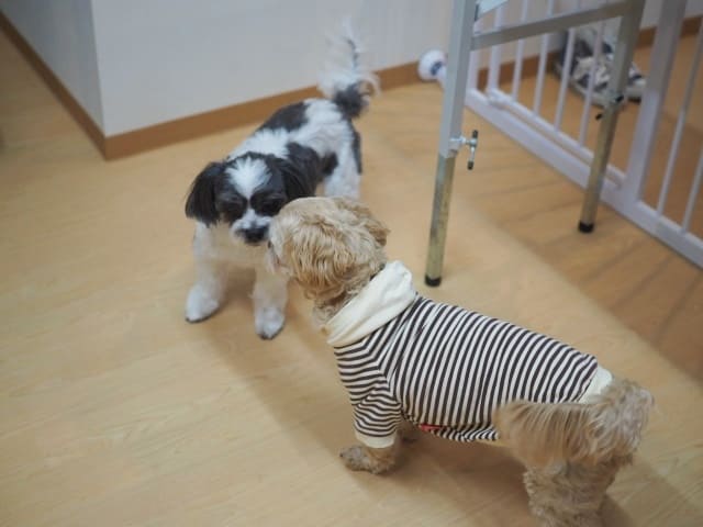 ぴーちゃんは他のわんちゃんが苦手なので、初めは抱っこしていたのですが、しばらくしてから下ろしてみました。