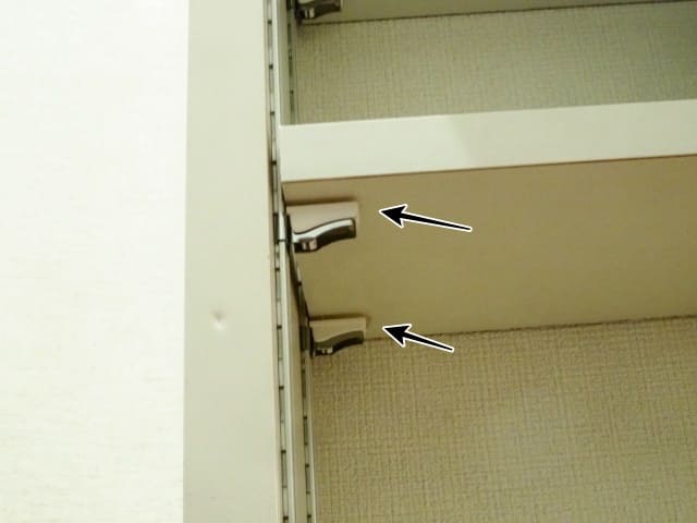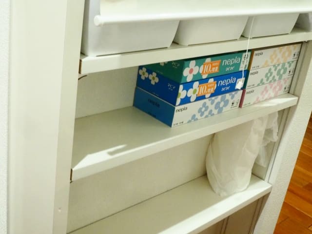剥き出しの棚が嫌で自分でロールカーテンを付けていたのですが、棚板が滑ることに気が付きました。