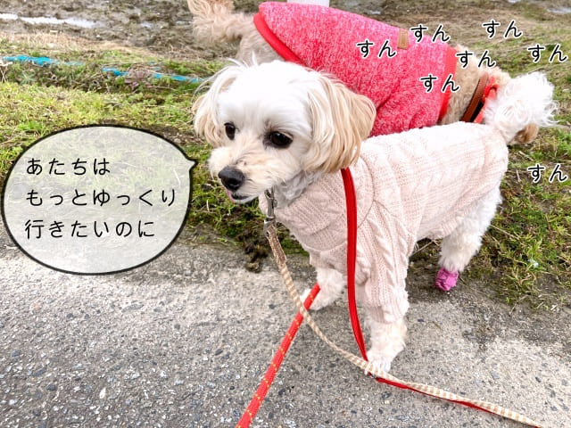 コニーは前に行きたくて引っ張るし、ミラは行きたくなくて踏ん張るし。