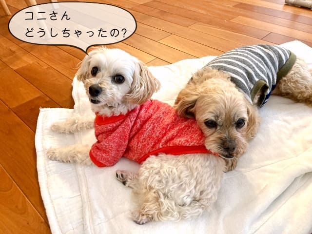 あれっ、コニーが床の上に座っているなんて珍しい。