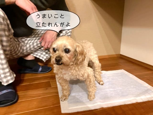 おしっこは漏れてもいいようにオムツとトイレシートを敷いてはいたけど、全然しないのでトイレに誘導。