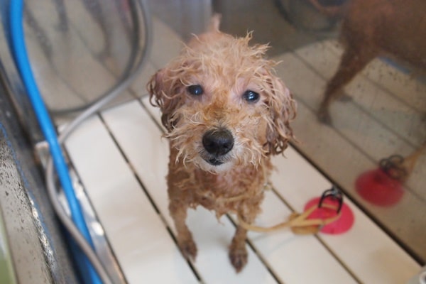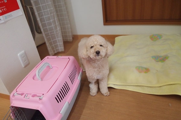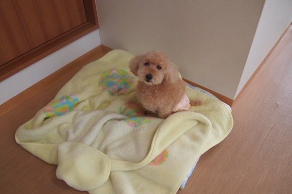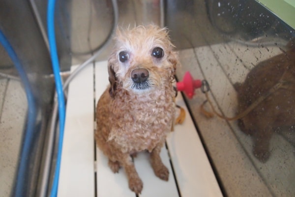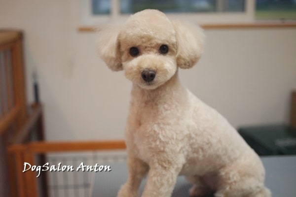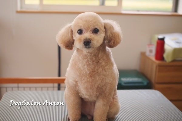 本当はトリミング予定でしたが、午前中に病院へ行った時に、背中に薬を兼ねた保湿剤とやらを付けられたそうです。