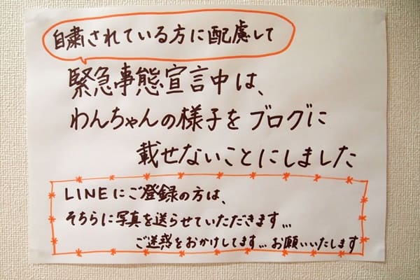 自粛されている方、されたい方に配慮して、緊急事態宣言中は、ブログにわんちゃんの様子を載せないことにします。